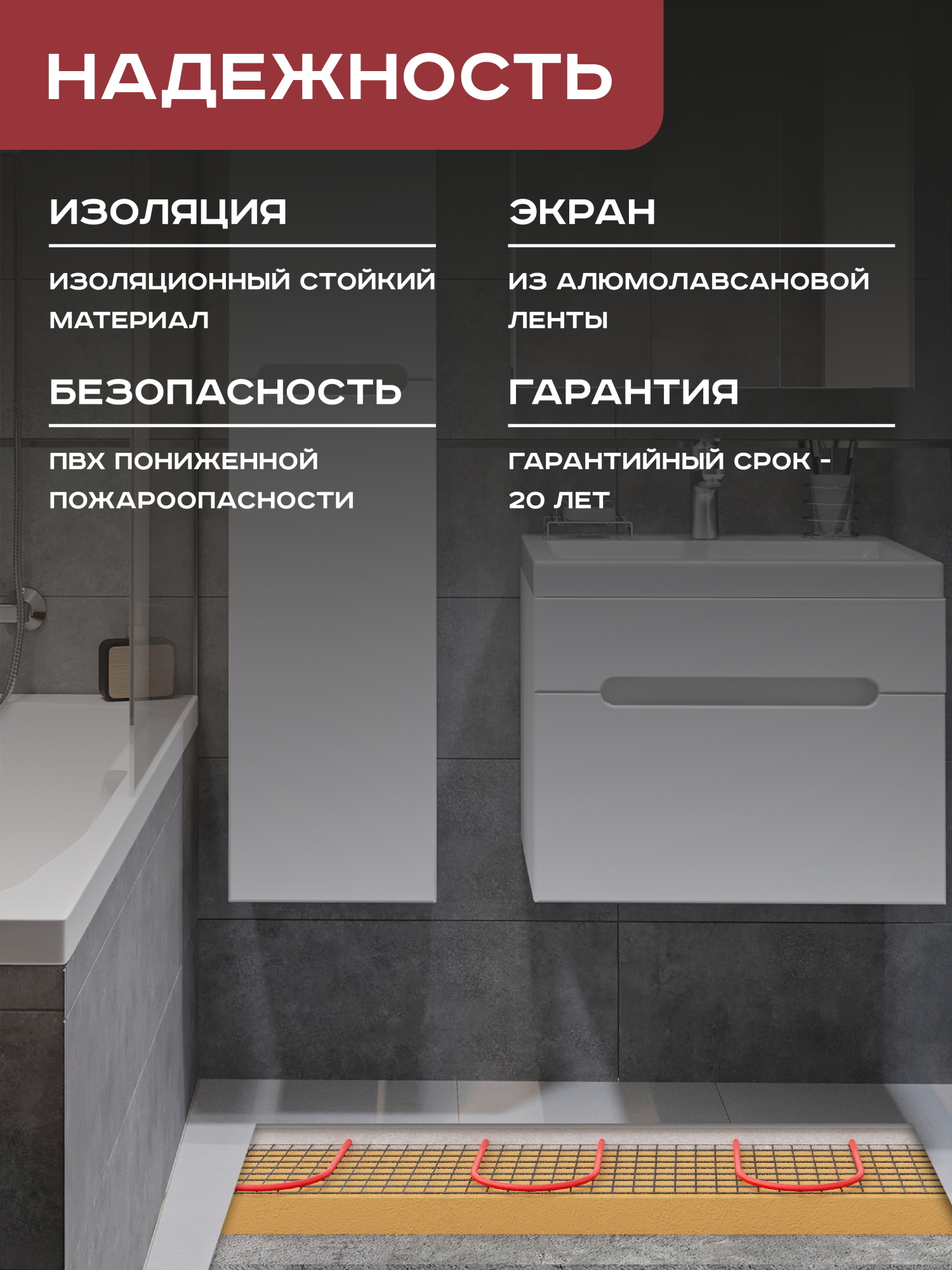 Нагревательный кабель можно укладывать под плиточный клей или в бетонную стяжку, что делает его идеальным для установки в ванной, кухне, прихожей и других помещениях дома или квартиры. Эта нагревательная секция подходит как для дополнительного, так и для основного обогрева помещений. Регулировка температуры осуществляется с помощью терморегулятора, который подключается к системе теплого пола.