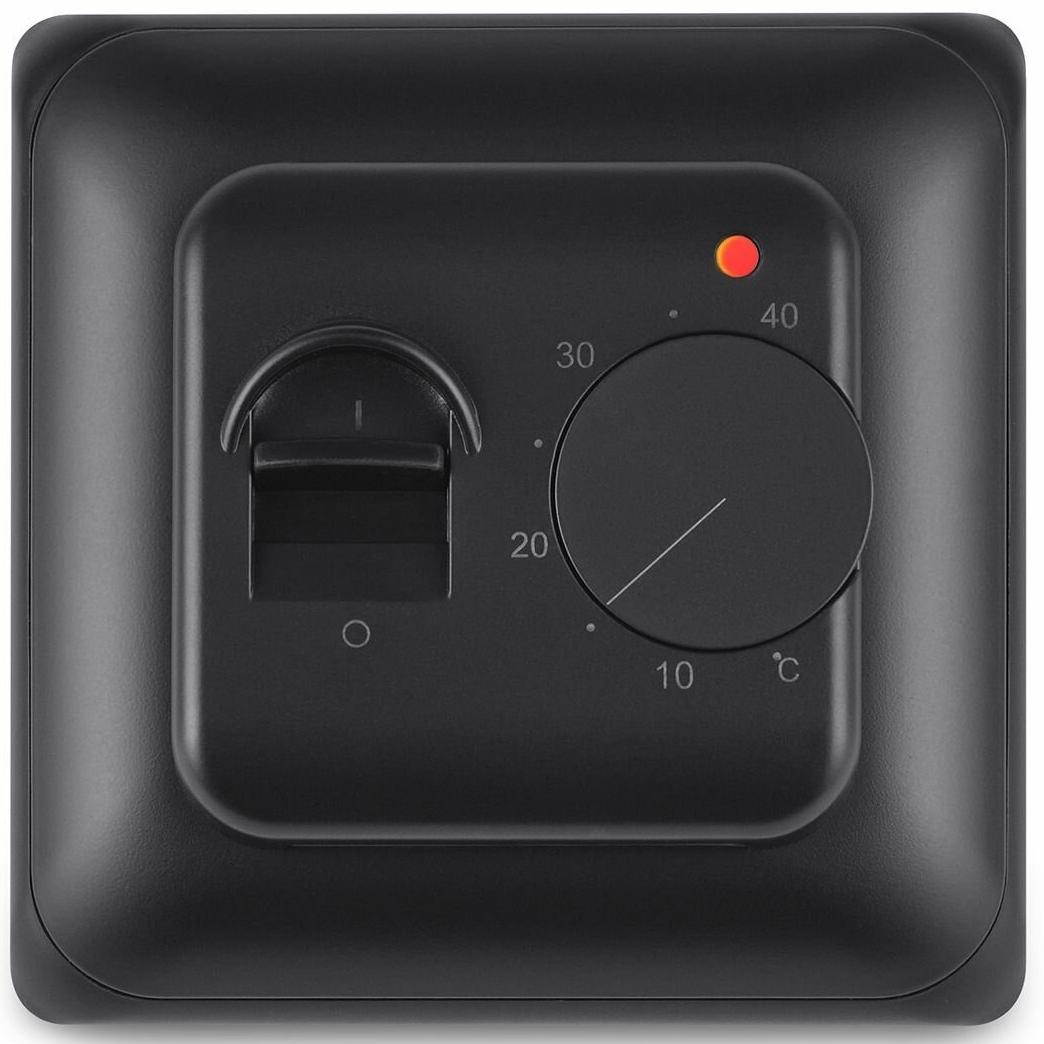 Индикатор на передней панели горит, когда нагрев активирован. Установка терморегулятора осуществляется в стандартной монтажной коробке (подрозетнике).