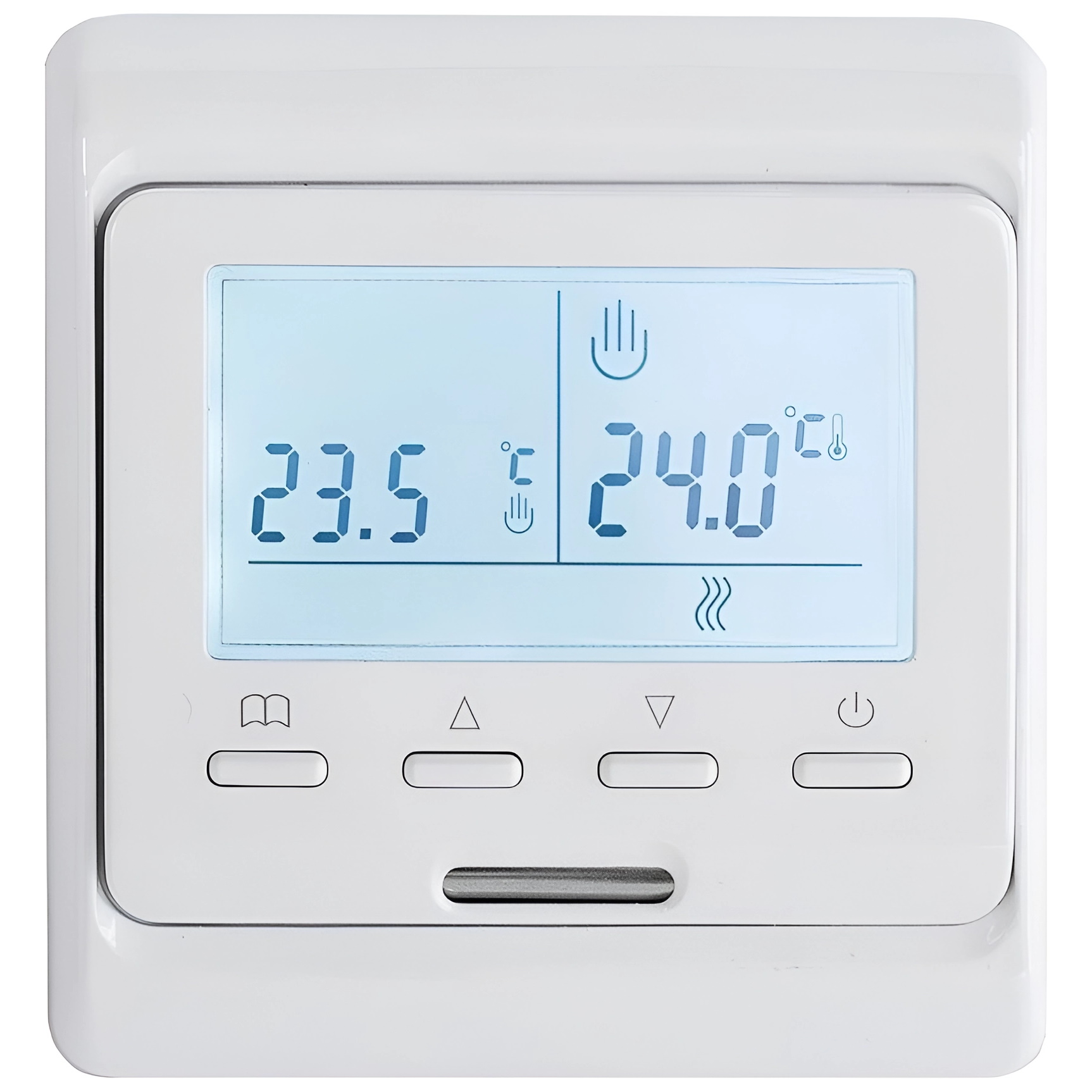 Терморегулятор имеет большой графический дисплей с подсветкой и управляется кнопками управления. Функция блокировки кнопок обеспечивает безопасность в случае наличия детей в доме. Также терморегулятор оснащен независимым элементом питания для сохранения настроек при отключении электропитания. После восстановления электропитания устройство автоматически возвращает предыдущие настройки подогрева теплого пола.
